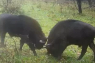 Выясняющих отношения зубров засняла камера в калужском заповеднике