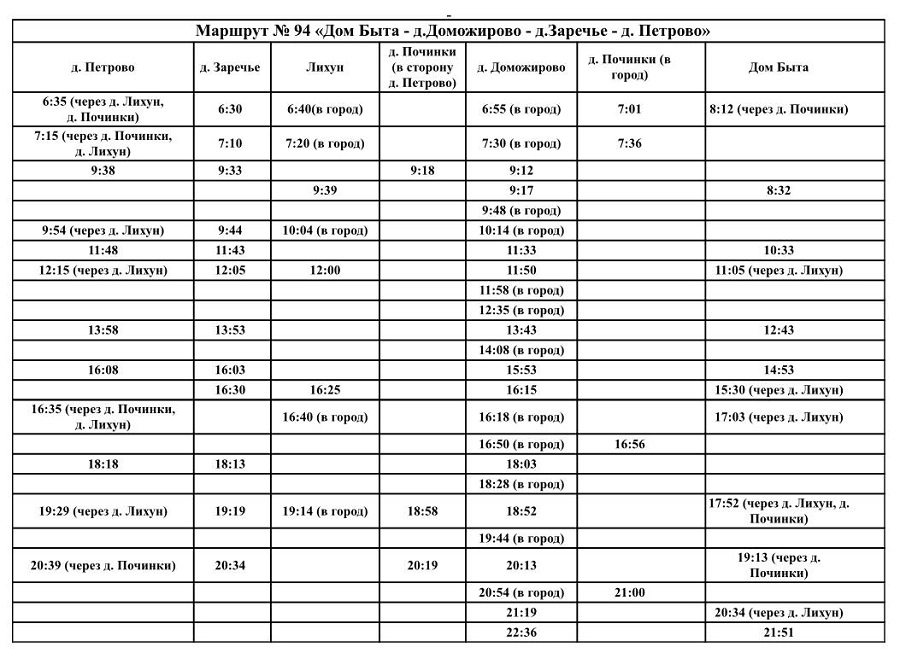 До деревни Починки будет продлён Маршрут № 94(л) «Дом Быта - д. Доможирово - д. Заречье - д. Петрово». В связи с этим изменится расписание, с ним вы можете ознакомится ниже.