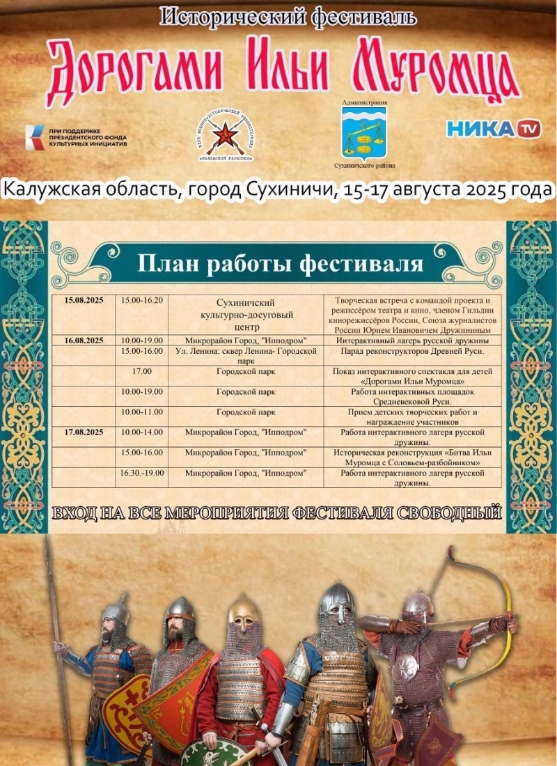 В правительстве Калужской области рассказали о фестивале, который пройдёт на территории Сухичией – «Дорогами Ильи Муромца». Продлится мероприятие с 15 по 17 августа.