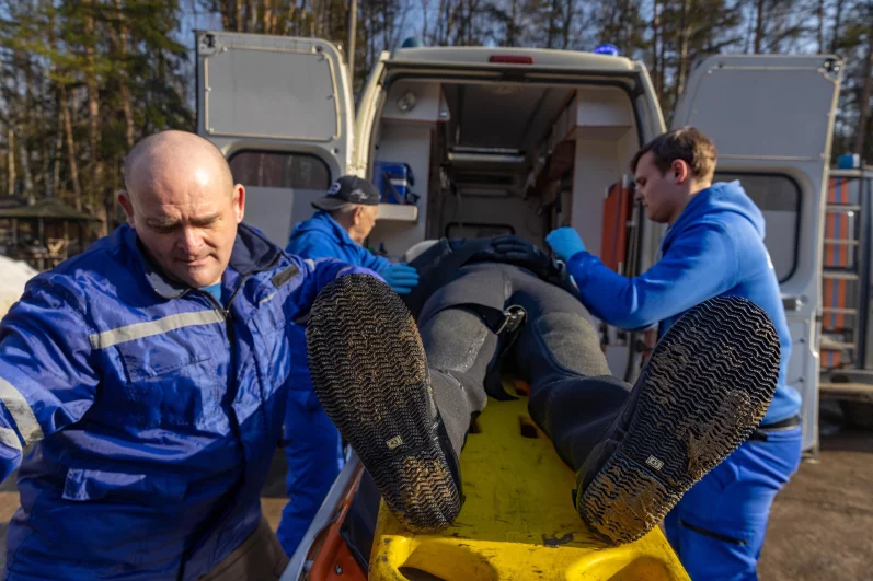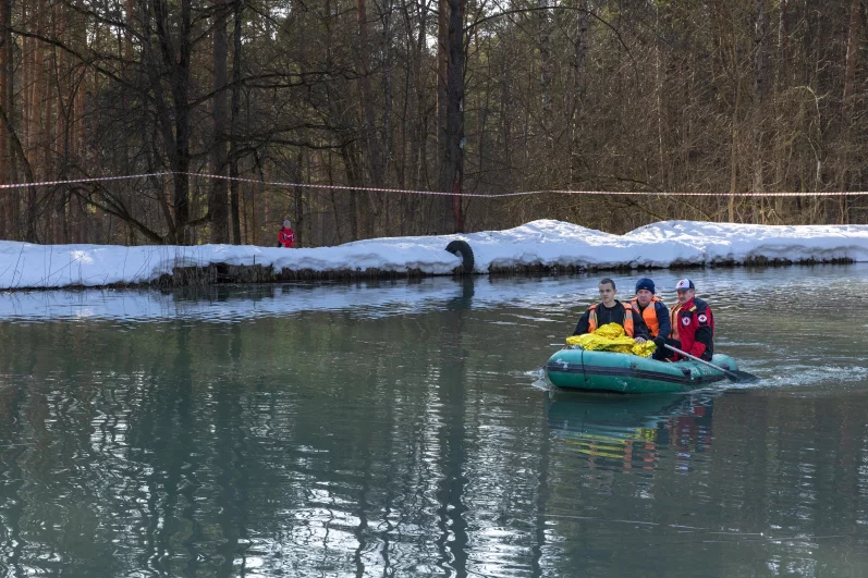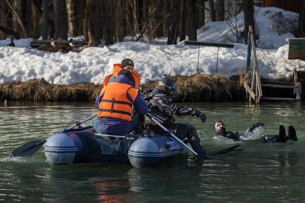 Эвакуировали «пострадавших» и доставляли груз на резиновых лодках. Всё по-настоящему: все участники в спасательных жилетах, в том числе и тот, кого увозят, и тот, кто встречает на берегу, — на случай падения в воду. Укутывали термоодеялом, перевязывали, вытаскивали из воды «утопающего» — конечно, на учениях в ледяной воде он был в тёплом гидрокостюме. В пункте медико-психологической помощи «спасённых» ждал горячий чай с печеньем.