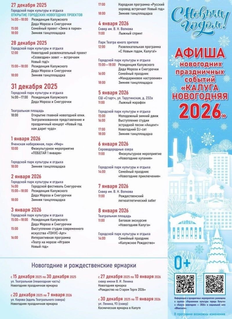 В преддверии Нового года опубликована афиша праздничных мероприятий, которые пройдут в Калуге с 27 декабря по 8 января.