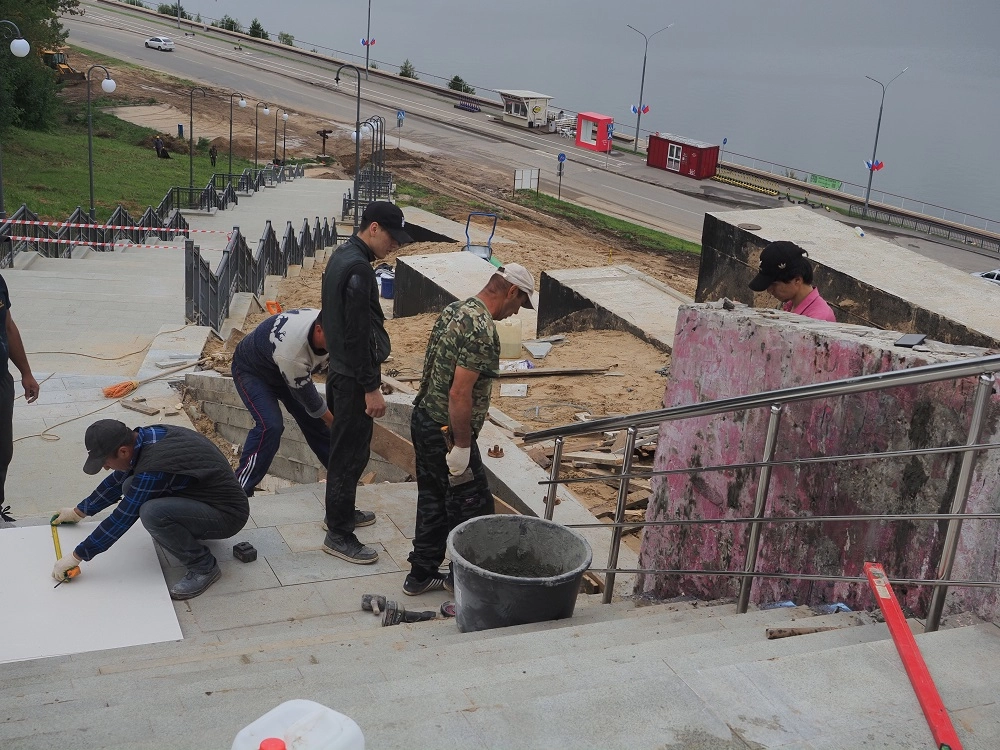 Сейчас все пустоты под лестницей заполнены бетоном. Все, что в момент оползня отошло и растрескалось, теперь укреплено и удержано насыпанным песком от дальнейшего смещения. Лестничные парапеты приподняты, аварийные места на подпорных стенах отремонтированы. Сейчас поставлена задача - открыть лестницу ко Дню города. Как выразились сами строители, окультурить место так, чтобы не было визуального безобразия.
