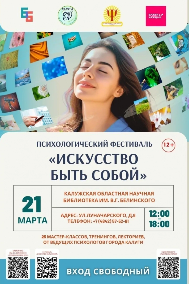 21 марта в Калужской областной научной библиотеке им. В.Г. Белинского пройдет психологический фестиваль, ставший уже доброй весенней традицией! Совершенно бесплатно калужане и гости города смогут принять участие в мастер-классах, интерактивных лекциях и других практиках, которые проведут психологи города Калуги.