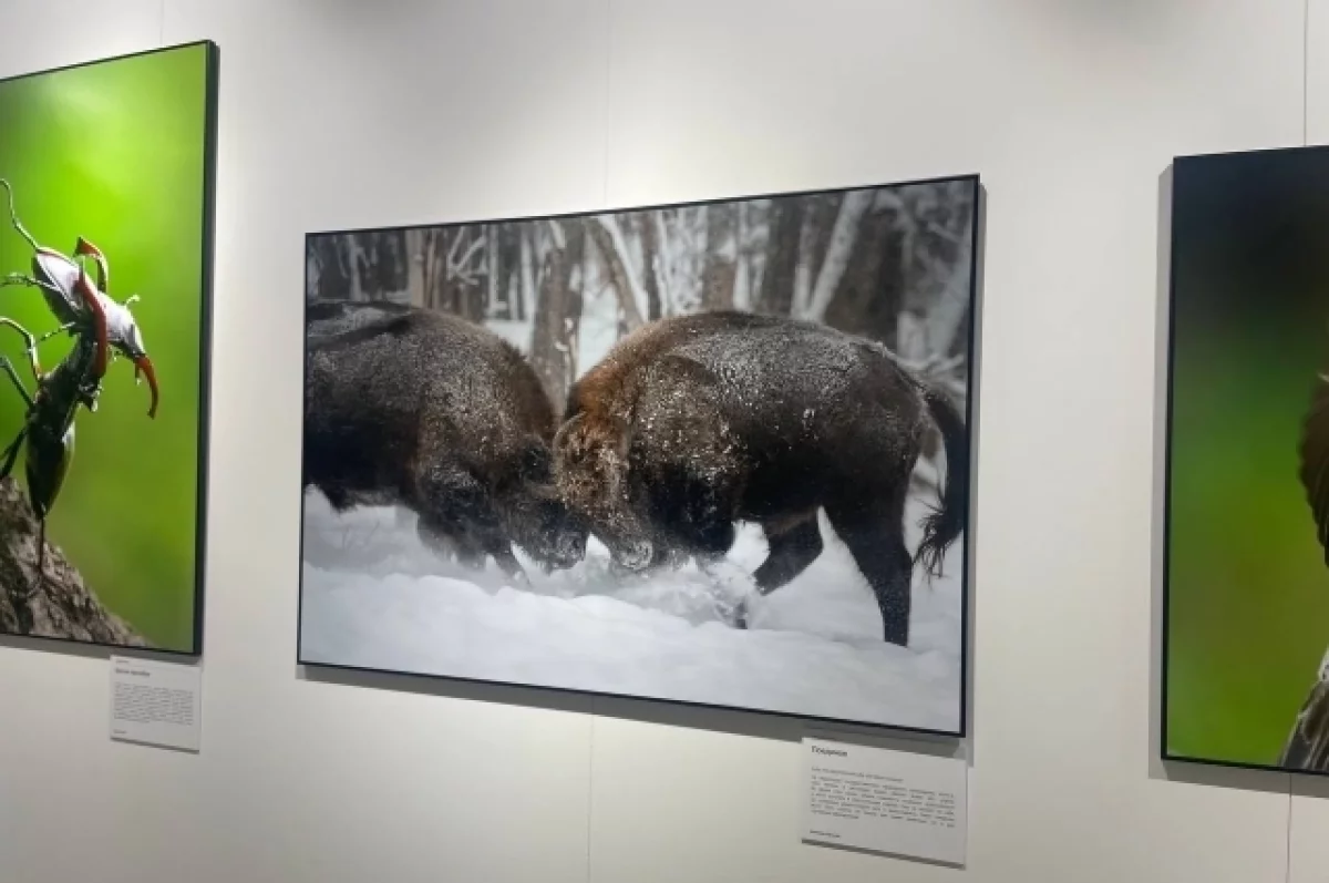 Среди представленных на выставке работ есть одна, показывающая гостям мероприятия красоту калужского леса. Она называется «Гладиаторы», фотограф Виталий Горшков смог запечатлеть момент схватки двух зубров.