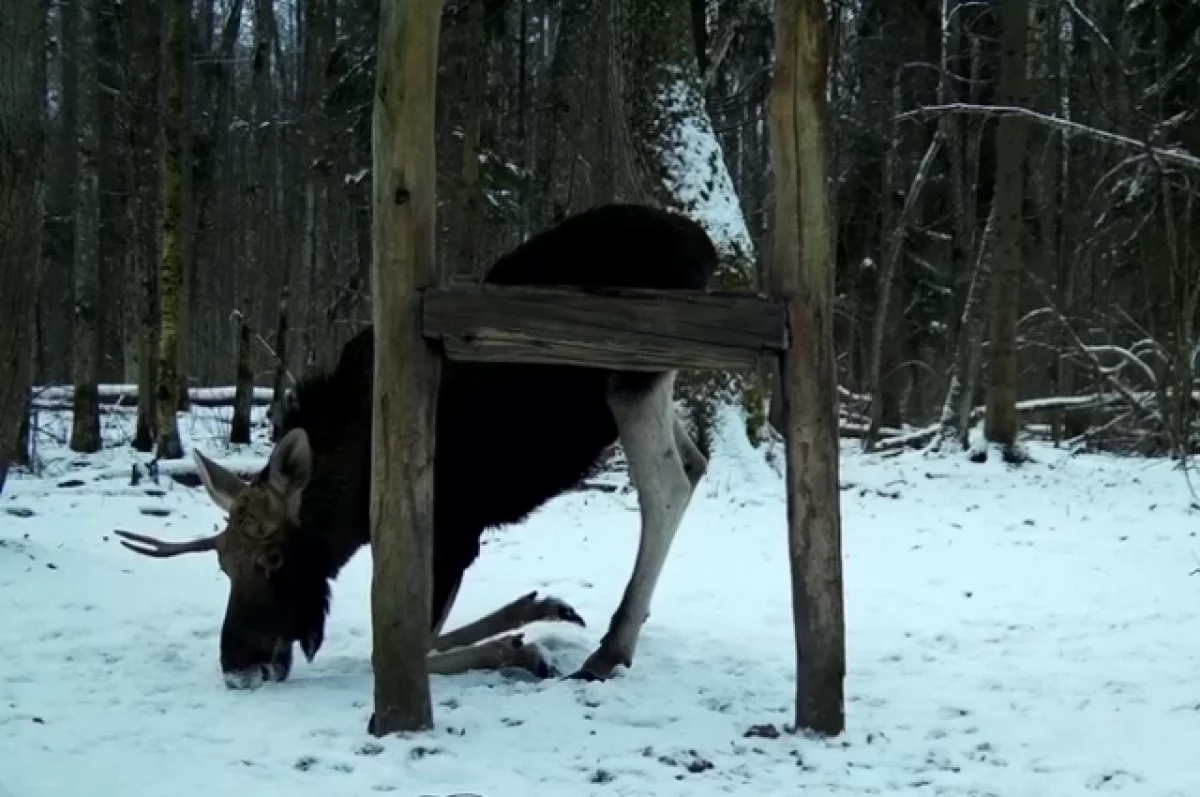 «Забавное видео запечатлели фотоловушки заповедника. У лося короткое туловище, широкая грудная клетка, длинные ноги. При этом передние ноги немного выше задних. Чтобы достать до земли, лосю приходится вставать на колени», — отметили сотрудники заповедника.