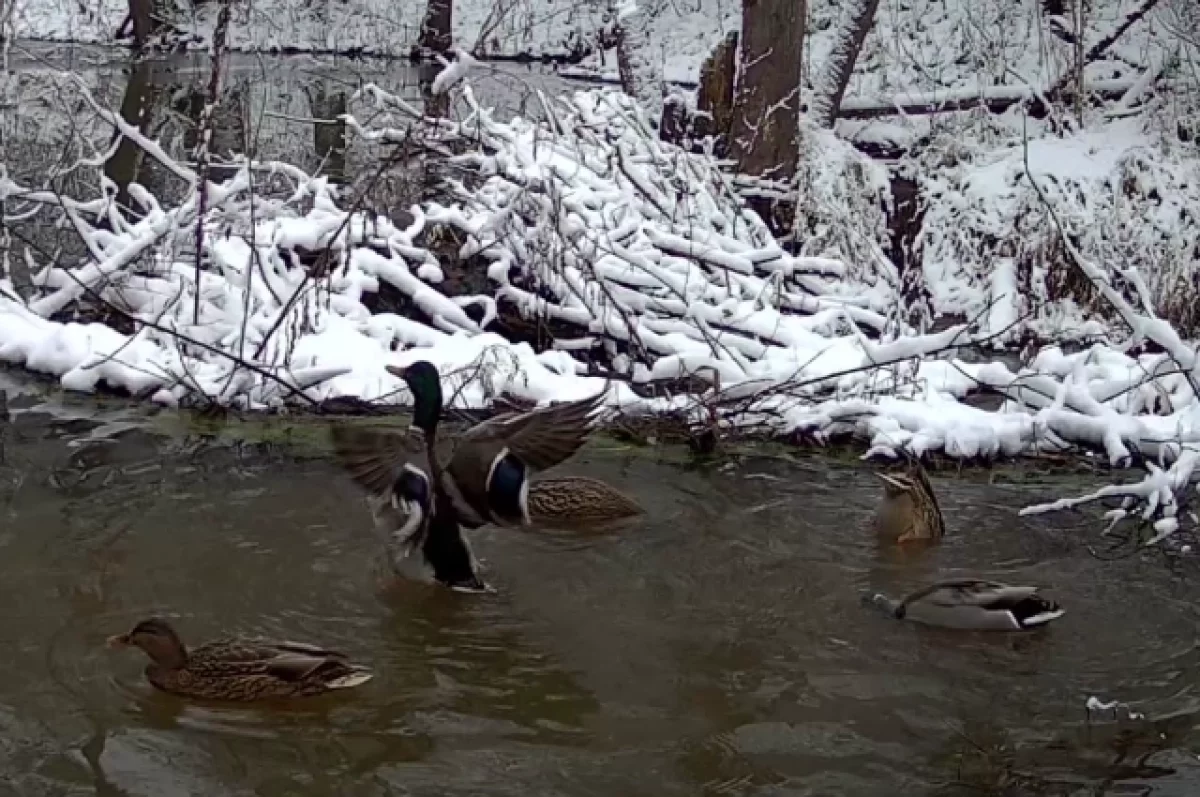 Стая диких уток попала в объектив фотоловушки «Калужских засек». Несмотря на холод, птицы решили искупаться в одном из незамёрзших лесных водоёмов.