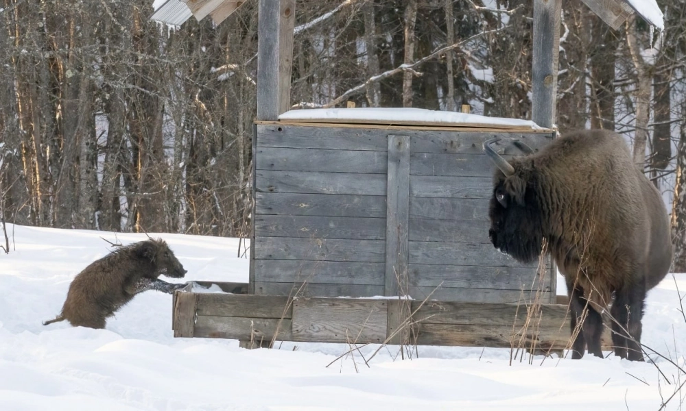 В поисках еды кабаны пришли на площадки, на которых подкармливаются зубры. Пропитания на них хватит на всех: ещё до наступления зимы жители региона скидывались на корм диким зверям.