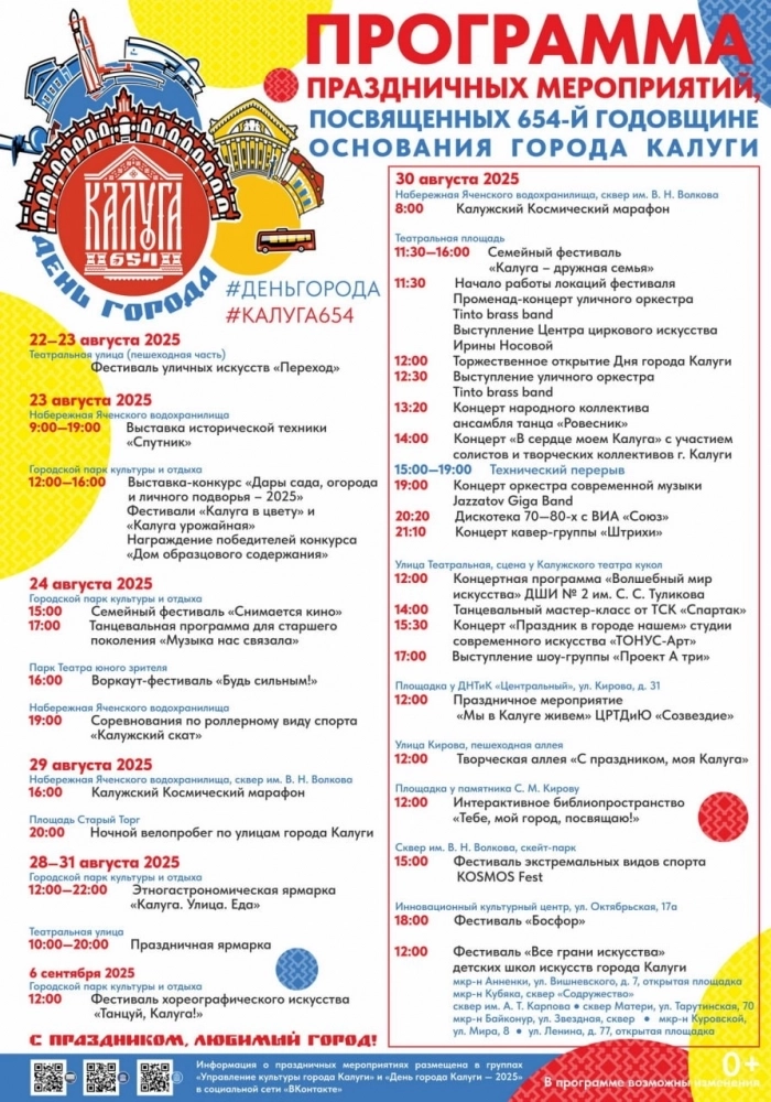 Мероприятия стартуют с самого утра: фестиваль «Калуга – дружная семья», выступление оркестра Tinto brass band, танцевальный мастер-класс от ТСК «Спартак» и многое другое. С полной программой праздничного дня можно ознакомиться в афише.