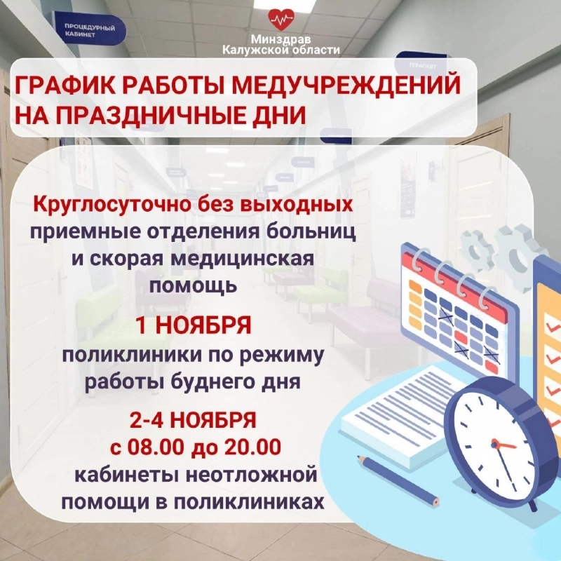 В министерстве здравоохранения Калужской области рассказали, как будут работать больницы во время выходных. Сегодня, 1 ноября, они все открыты по будничному расписанию.