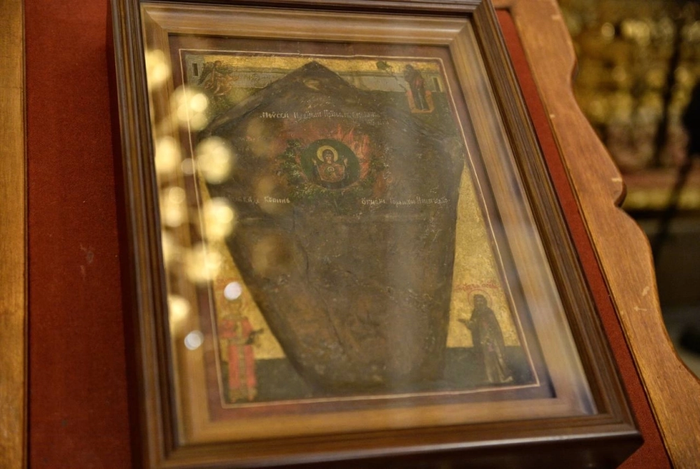 Образ «Неопалимая Купина» — одна из древних икон, принесена палестинскими иноками в Москву, в дар Великому князю Московскому в XIV веке. Она была написана Синайскими иконописцами на камне той скалы, где Моисею явился таинственный куст.